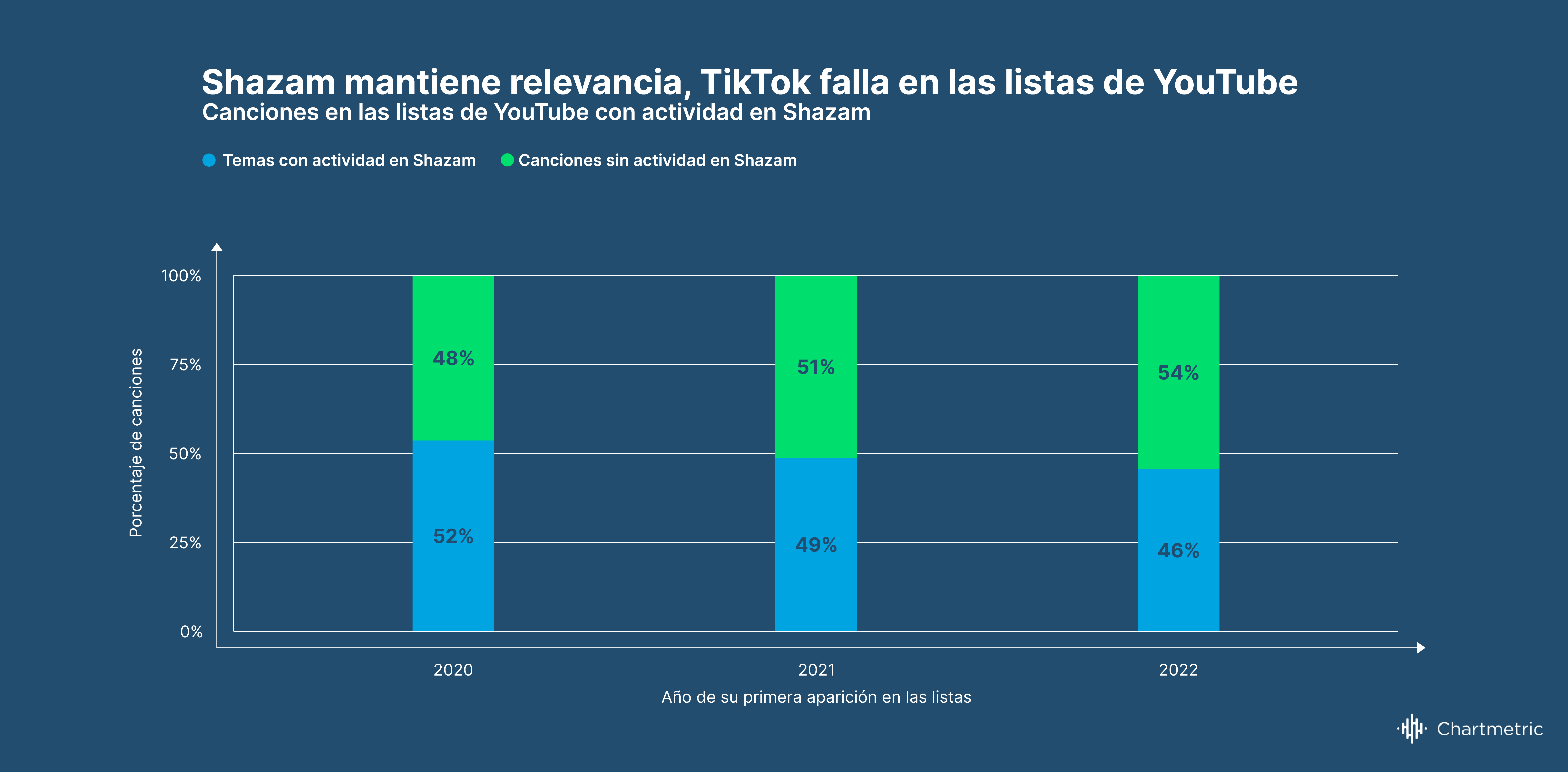 En cuanto a las listas de YouTube, TikTok parece no tener ninguna relevancia. Desde el 2020, la cantidad de temas en las listas de YouTube con éxito concurrente en TikTok osciló entre el 5 y el 10 por ciento. Por ejemplo, sólo 62 de las 600 canciones únicas (10%) en las listas de YouTube tenían nuestra definición de éxito simultáneo en TikTok en 2021. Esto sugiere una escasa relación entre los mundos de consumo de YouTube y TikTok, a pesar de la avalancha de comentarios en vídeos de YouTube que dicen "TikTok me trajo aquí". Esto se refiere a que comentarios importantes no se traducen necesariamente en números de consumo.
